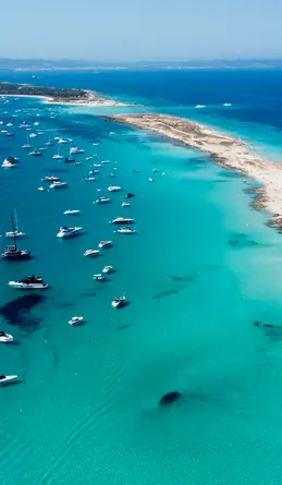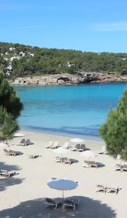 Die Cala Comte zählt zu den bekanntesten Stränden Ibizas – und das nicht ohne Grund. Ihr klares, leuchtendes Wasser schimmert je nach Lichteinfall in verschiedenen Blau- und Türkistönen, während vorgelagerte Inselchen das Panorama ergänzen.